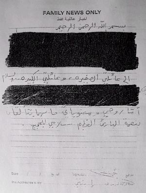 信的開頭寫道:“以慈悲的神的名義”,接下來有6行字被劃掉,再往下是“向我的小家庭和大家庭問好”,下面又有3行字被劃掉,接下來的文字是“感謝老天,我的精神很好,我的士氣很高。向所有人問好。”。這封信經過了駐伊美軍的嚴格審查,其實際內容基本已經不存在。魯沙旦說:“三分之二的內容被劃掉了,只剩下17個字,根本無法理解其原意。”(章田)