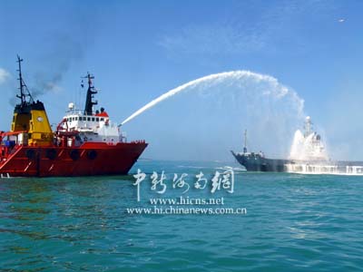 此時,觀摩演習(xí)的人們發(fā)現(xiàn),在出事船只周圍,已經(jīng)有多條各類救助船開始行動,中國救助船“南鷹”輪和“南海救一六八”輪一左一右向燃燒著的遇難船只進(jìn)行壓制性滅火。兩只泡沫槍和一只高壓水槍對準(zhǔn)海難船強(qiáng)制滅火。此時的場面蔚為壯觀,一只高壓水槍激起的水霧在熱帶陽光的照耀下出現(xiàn)了一道漂亮的彩虹。