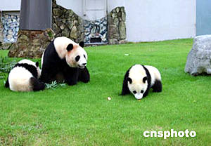 日本和歌山市白浜野生動物園是中外合作繁育大熊貓最多的“兵團”。十年前,中日雙方簽定協議,聯手繁育研究大熊貓,現在該園已由當初的兩只大熊貓繁育成有六只大熊貓的大家族了。圖為大熊貓“隆浜”、“秋浜”與母親“梅梅”在日本和歌山白浜野生動物園玩耍。作者:肖龍聯