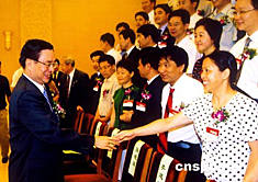 第八屆中國(guó)青年科技獎(jiǎng)六月二十八日在北京揭曉并頒獎(jiǎng)。圖為中共中央政治局委員、中央人才工作協(xié)調(diào)小組組長(zhǎng)賀國(guó)強(qiáng)接見(jiàn)獲獎(jiǎng)代表。作者:郭昊