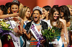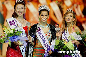 6月29日,令人矚目的2004國際旅游小姐冠軍總決賽在浙江杭州落下帷幕。印度選手ZABINA ABDUL RASHID KHAN,(中)從來自51個國家的53位旅游形象大使中脫穎而出獲得冠軍。德國選手JOHNALENA KWASOW獲得亞軍,中國選手鈔俊男(左)也發揮了較好的水平,在強手如林的競爭中獲得第三名。作者:饒強