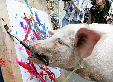 “豬的藝術”:一只被稱作“Malevich”的小豬在莫斯科市區“作畫”,這是當地藝術家展示動物繪畫技藝的一部分。