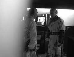 下午5時,拍攝完《紀》劇當天戲后,張國立又穿著皇袍到《少》劇片場和張默表演了一場父子對手戲。他們走進靠近記者所在側(cè)門的一間小屋,記者側(cè)耳聆聽了他們父子對臺詞的過程。據(jù)悉,張默扮演雍正皇帝兒子弘晝,而張國立則扮演皇帝。工作人員叫張默進場不久,只聽見張默說:“兒臣救駕來遲,請皇阿瑪贖罪。”而張國立則立即指點:“不慌,你再來一遍,要急匆匆進來。”隨后張默又沖進小屋重復了一遍臺詞,張國立叫了一聲“平身”,馬上又叮囑張默下跪時“眼神還要低一點”。很快兩人又重復了一遍臺詞,最后大約拍攝了兩條,這場戲就過了。
