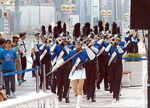 步操團奏樂表演為記者會助聲勢。歌影紅星劉德華7月8日在香港尖沙咀星光大道舉行《道地百果園劉德華Vision Tour演唱會2004》記者會,大會特意安排步操團奏樂表演,為記者會助聲勢。作者:鄧慶樂
