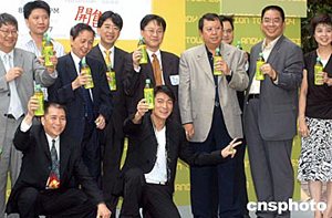 歌影紅星劉德華7月8日在香港尖沙咀星光大道舉行《道地百果園劉德華Vision Tour演唱會2004》記者會,劉德華與演唱會主辦機構(gòu)高層、贊助商及各大傳媒嘉賓會上以綠茶代酒預(yù)祝演唱會舉辦成功。作者:鄧慶樂
