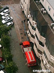 七月十一日,北京消防隊的消防車在遭遇罕見雷暴雨后地下設施被淹沒的中國新聞社大廈和西城電話局抽水排除水患。十日的特大雷暴雨將不少北京市的樓宇地下室淹沒。中新社記者:鄒憲