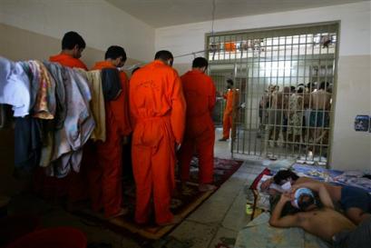 曾發生美軍虐待政治犯事件的1A和1B囚室目前關押著鬧事者和問題犯人。監獄內由伊拉克控制的監區共關押有1200名犯人。在大多數囚室里,由于夏天溫度很高,犯人們都毫無生氣地躺在地上的泡沫床墊上,多數人穿著白色的長短褲或者更少的衣服。