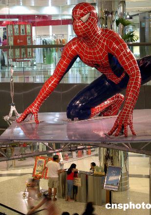“蜘蛛俠”鬧市宣傳。正在香港熱播的電影《蜘蛛俠2》耗資二億制作,是上集的兩倍,其中五千四百萬美元用于計(jì)算機(jī)特技之上。圖為在香港新世界中心商場(chǎng)設(shè)置的蜘蛛俠造型吸引途人目光。作者:洪少葵