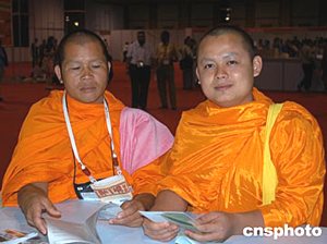 2004年7月初,兩位身著袈裟的泰國僧人,作為志愿者為第十五屆世界艾滋病大會會務服務。中新社記者:曾利明