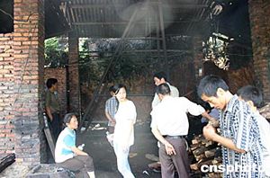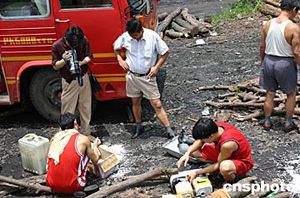 十四日七時,湖南湘潭雙扶煤礦系統進行提升時,因電纜折斷,造成電纜短路起火,導致井筒木支架起火燃燒,使當時正在井下作業的九十五人被困。現已確認有六人死亡,還有三人被困井下,下落不明。圖為發生礦難的井口。作者:白祖偕