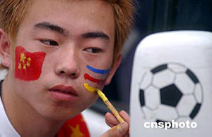 七月十七日,二零零四年亞洲杯足球賽揭幕戰將在中國隊和巴林隊之間展開,一位中國球迷認真描畫臉譜,為中國隊加油。中新社記者:武仲林