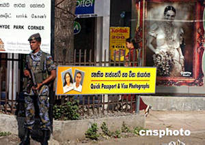 七月的斯里蘭卡首都科倫坡街頭,一位全副武裝的衛兵在婚紗店執勤。斯里蘭卡至今對反恐怖活動百倍警惕。中新社記者:賈國榮