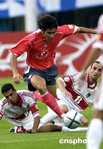 7月19日晚,2004年亞洲杯B組比賽在濟南開戰,歷史上首次進入亞洲杯決賽圈的約旦隊迎戰2002年世界杯四強之一的韓國隊。中新社記者:武仲林