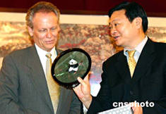 湖南省常務副省長于幼軍七月十九日會見了美國愛普斯頓公司國際公司董事長麥克·大漠先生一行。麥克表示,愛普斯頓公司已決定在長沙設立中國中部第一家辦事處,并有意介入湖南的項目開發。圖為于幼軍將一幅傳統手工藝品湘繡贈與麥克先生。作者:白祖偕