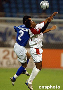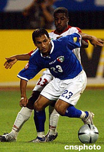 7月19日晚,2004年亞洲杯B組科威特隊與阿聯酋隊的比賽在濟南山東省體育中心開戰?仆仃(藍)發揮出色,最終以3比1大勝阿聯酋隊。中新社記者:武仲林