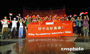一百多名來自美國、英國、委內瑞拉、巴西、馬來西亞、印尼、緬甸等七個國家和香港、澳門特別行政區的華裔青年,二十五日晚在廣州華南師大與廣州青年歡聚一堂。印尼華裔青年在聯歡會上表演節目。作者:羅仰明