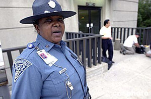 民主黨大會當地時間七月二十六日在波士頓開幕,為確保大會安全,自上周五以來,麻州州警取消休假,每日工作13小時,麻州羅根機場更是警察云集。圖為便衣警察在搜查一位自拉斯維加斯登機的攜帶毒品的男性嫌疑人,非裔警官阿克嫚叮囑記者不要拍到便衣警察的臉。作者:陳鋼
