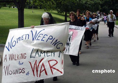 美國民主黨全國大會舉辦之際,波士頓街頭常有各種訴求的游行示威。這是一個名為“婦女哭泣”的行走活動穿過市中心的波士頓公共公園,她們穿黑衣、抱著襁褓,表達對戰爭摧殘生命的不滿。作者:余東暉