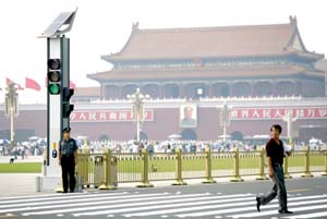 中新網8月2日電 據《京華時報》報道,昨天,北京市首個太陽能人行橫道交通信號燈在天安門廣場投入使用。據介紹,這也是建國以來天安門廣場首次安裝交通信號燈。此舉將大大降低游人橫穿馬路時的危險系數。