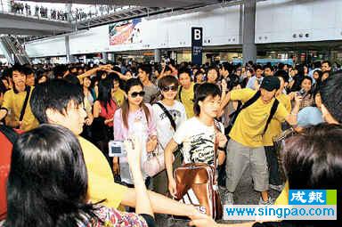 昨午機場擠滿各個歌手的歌迷,當中以S.H.E的Fans數目最多兼最有組織性。S.H.E的Fans為數過百人,其歌迷會更自發組成保安隊,在S.H.E踏出機場時,約廿名歌迷會成員組成的保安隊已一涌而上,沖進禁區并筑起人墻保護偶像。