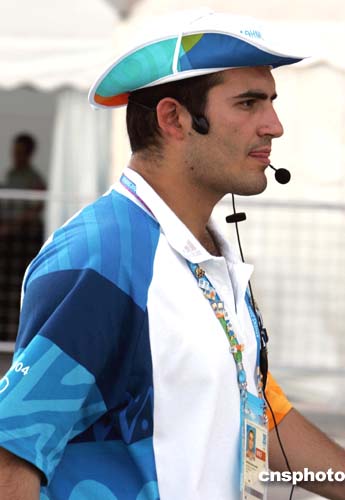 (當地時間)二○○四年八月三日清晨,一名英俊的雅典奧運會男志愿者在記者新聞中心外調度穿梭巴士。中新社記者:任晨鳴