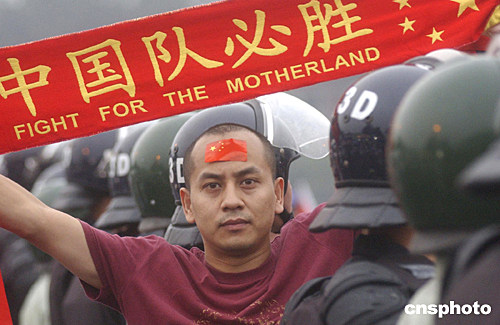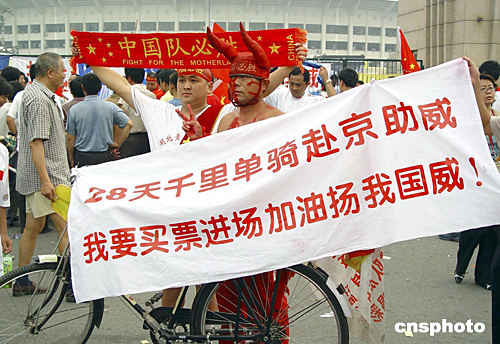 走在沮喪球迷的隊伍中,心情難免不好。這時從對面跌跌撞撞地走來一位年輕的中國球迷,用沙啞的嗓音不停地唱著《歌唱祖國》。看得出,也許是失敗的打擊太大,他已經有些神志不清了,身邊的女友眼含淚水,默默地陪在他身邊。許多經過的女球迷也已經眼眶濕潤。