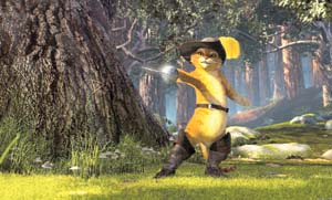5.貓咪殺手鉆進史瑞克的衣服,然后從衣服中鉆出的鏡頭模仿了《異形》系列。在那套恐怖片中,樣子惡心的異形總是從人類宿主的體內血淋淋地鉆出來,恐怖至極。本片卻化血腥為幽默。