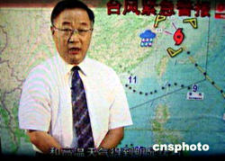 中國氣象局局長秦大河八月十二日在中央電視臺黃金時間的天氣預報節目上首次亮相,發布中國大部分地區即將出現臺風和暴雨的緊急警報,同時顯示紅色的中國地質災害警報。中新社記者:賈國榮