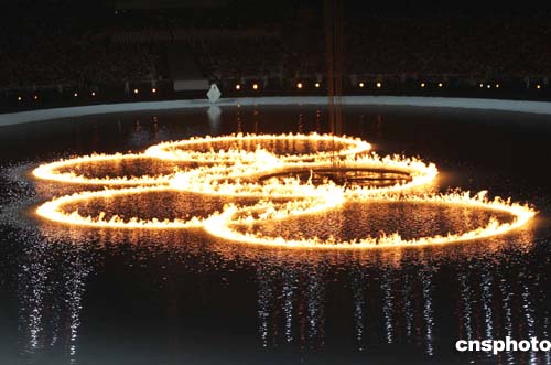 當(dāng)?shù)貢r(shí)間八月十三日晚,第二十八屆奧運(yùn)會(huì)在希臘雅典開幕。圖為開幕式上奧運(yùn)五環(huán)標(biāo)志從“愛琴海”中升起。中新社記者:毛建軍