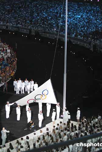當地時間八月十三日晚,第二十八屆奧運會在希臘雅典開幕,奧運五環旗在會場緩緩升起。中新社記者:毛建軍