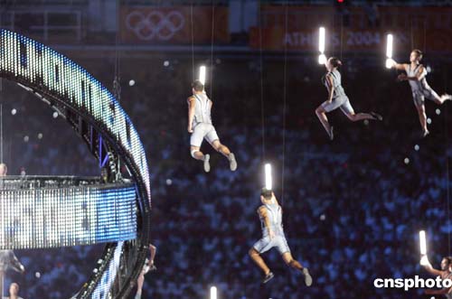 當地時間八月十三日晚,第二十八屆奧運會在希臘雅典開幕。圖為奧運開幕式上的飛天表演。中新社記者:毛建軍