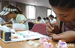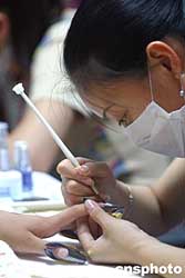 八月十四日,來(lái)自日本、韓國(guó)和中國(guó)臺(tái)北、中國(guó)大陸的四十余名選手,在北京國(guó)際展覽館舉行2004國(guó)際美甲藝術(shù)邀請(qǐng)賽。作者:韓藝冰