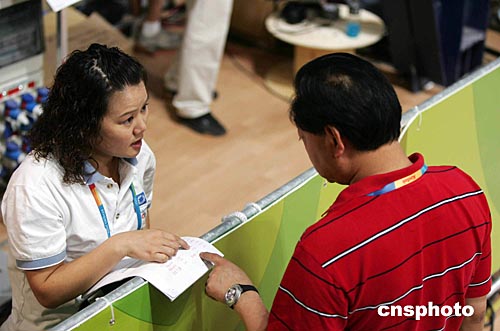 當地時間八月十五日上午,在雅典舉行的第二十八屆奧運會女子十米氣手槍射擊決賽賽場,中國射擊隊前奧運冠軍張山為中央電視臺做主持人客串記者。圖為張山與中國射擊隊教練許海峰在場邊交談。中新社記者:毛建軍