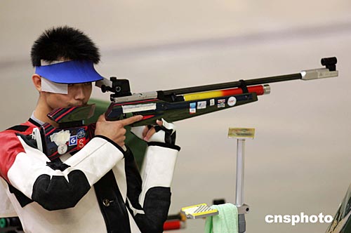 當地時間八月十六日,中國選手朱啟南(左)與李杰在雅典奧運男子十米氣步槍射擊比賽中分獲金、銀牌。朱啟南并以七百零二環的成績打破世界紀錄。中新社記者:毛建軍