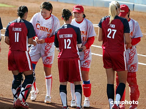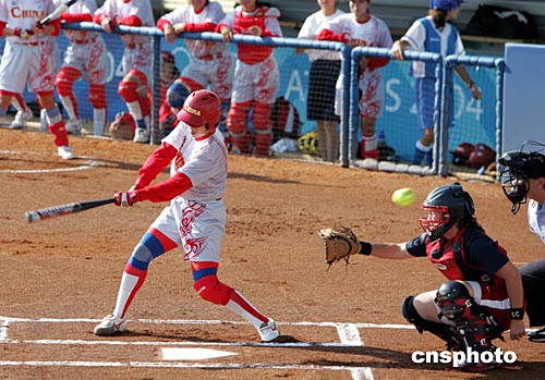 美國女壘在首局比賽中就有出色表現。先是成功地上到一壘,隨后中國隊投手投出四個壞球保送對方一名隊員又上壘成功。在形成關鍵的三球兩擊時,中國隊投手再投出一個壞球,美國隊形成三壘都有人的有利局面。隨后美國隊隊員利用一次漂亮的擊打,兩個隊員回到本壘得分,取得三比零領先。