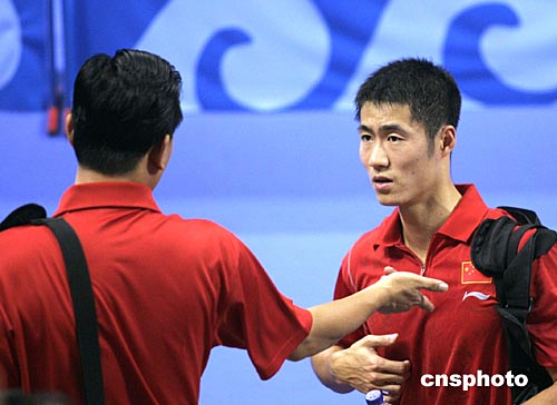 雅典時間8月17日,世界排名第一的奧運會乒乓球男單頭號種子選手王勵勤以4比1戰勝荷蘭老將凱恩,率先闖進男單前16名。中新社記者:張煒
