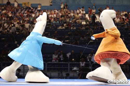 8月17日在雅典奧運會擊劍比賽前,可愛的奧運吉祥物為觀眾上演了一場劍法“秀”。
