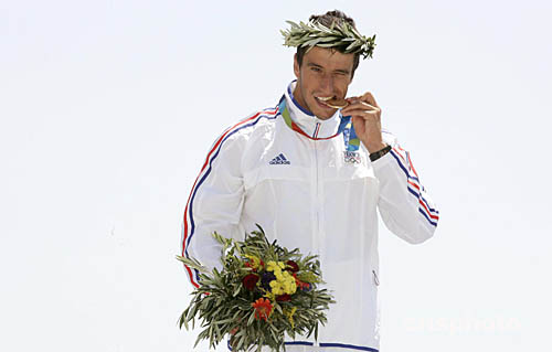 法國選手托尼·埃斯坦蓋在當地時間8月18日的賽事比賽中奪得單人劃艇障礙回轉決賽冠軍后登臺領獎的畫面。