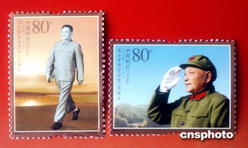 為紀念鄧小平誕辰100周年,中國國家郵政局將于2004年8月22日發行《鄧小平同志誕生一百周年》紀念郵票1套2枚,小型張1枚。兩枚郵票的名稱分別為:中共中央總書記(左)、中共中央軍委主席(右),面值均為人民幣80分。小型張圖案名稱為:改革開放和現代化建設總設計師,面值人民幣6元。中新社記者:鄒憲