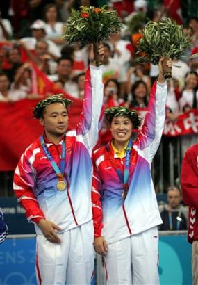 中新社雅典八月十九日電 中國雅典奧運羽毛球隊今天一掃前兩日男單、男雙盡墨的陰霾。繼張寧摘取女單桂冠后,悉尼奧運冠軍張軍/高崚又衛冕成功。在剛剛結束的混雙決賽中他們以二比一的總比分戰勝了來自英國的羅伯遜/埃姆,三局比分分別為十五比一、十二比十五和十五比十二。