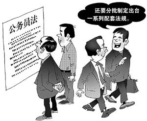 《公務(wù)員法》已進入立法程序,2005年有望出臺。有關(guān)部門還將根據(jù)實際情況,分批制定出臺有關(guān)公務(wù)員范圍、職務(wù)職級、錄用、考核、工資、培訓(xùn)、申訴控告等一系列配套法規(guī),并研究修改公務(wù)員行政處分條例草案。