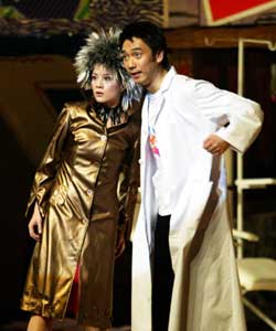 《麻花2》的舞美也是“后現(xiàn)代”風(fēng)格的典范。演出一開場,3046年閃亮的舞臺和古怪的時空穿梭機便出現(xiàn)在觀眾面前,在耀眼的光芒中,2004年的“醫(yī)院”以寫實與抽象相結(jié)合的方式出現(xiàn):矮小的窩棚一樣的病房上面,陳列著巨幅“現(xiàn)代派”油畫,客廳、黑貓這些形象交錯混雜在一起,乍看上去,《麻花2》的舞臺頗像北京七二七工廠附近的酒吧。演員拿的道具也頗有象征效果:近一米長的大針管、板磚一樣的心臟起搏器……《麻花2》將怪誕二字做到極致。