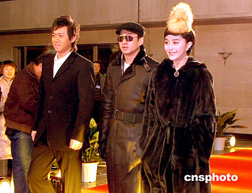 第七屆中國長春電影節一月十二日晚在長春落幕。在當晚的頒獎晚會上,眾多明星出席。圖為著名影星范冰冰(右)、周杰(中)和王學兵一同走過星光大道。作者:吳兆飛
