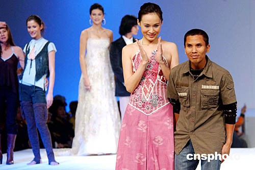1月20日,在“香港時裝節秋冬系列”及“香港國際時尚薈萃”上,舉辦一場國際時裝設計師表演,圖為印度尼西亞時裝設計師A.Sofiyulloh與名模楊崢登臺謝幕。作者:洪少葵