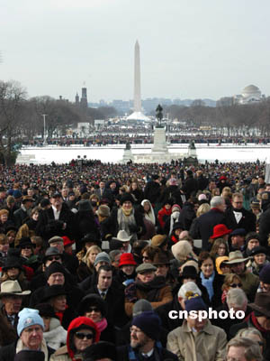當天華盛頓雪后初晴,但天寒地凍,數(shù)十萬人聚集在從國會山到華盛頓紀念碑的街道和草坪上,參加布什的就職典禮。他們當中既有為布什連任歡呼者,也有不滿布什政府的抗議示威者。