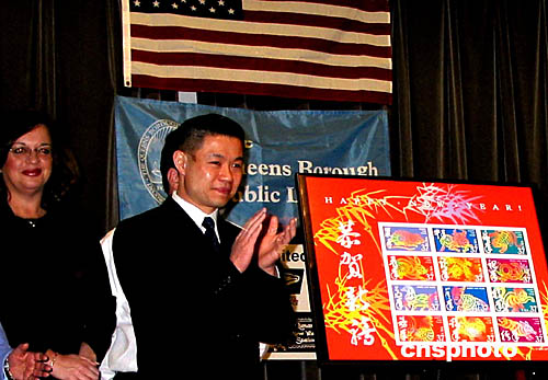 當地時間一月二十一日,美國郵政局正式發行中國農歷新年生肖郵票紀念版小全張,為從一九九二年開始在發行的美國中國生肖郵票畫上句號。圖為在華裔聚居的紐約法拉盛舉行的發行儀式。作者:趙海燕