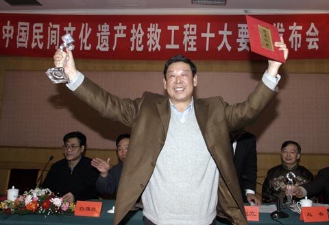 中新網北京1月29日電(張煒)27日,2003至2004年度中國民間文化遺產搶救工程十大新聞在北京揭曉。河南省全面實施民間文化遺產搶救工程、西部民歌搶救行動傳捷報、趙文瑄捐資百萬支持民間文化遺產搶救等被評為民間文化遺產搶救工程十大新聞。