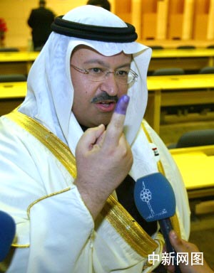 1月30日,伊拉克大選正式拉開帷幕,伊臨時政府總統亞瓦爾在巴格達參加投票后向群眾展示自己的手指。每位參加投票者在投票后都要在手指上涂上顏料作為標記。