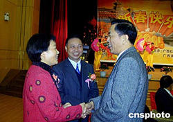 一月三十日,“二○○五年廣西首府僑界迎春茶話會”在南寧舉行,三百多名僑界人士到會,世界廣西同鄉聯誼會主席陳奇培、馬來西亞廣西總會會長孔慶庶等海外僑領也出席了茶話會。廣西自治區政府副主席劉新文女士(左)、廣西自治區僑辦主任李漢金(中)和出席茶話會的海外僑領親切交談。作者:劉萬強