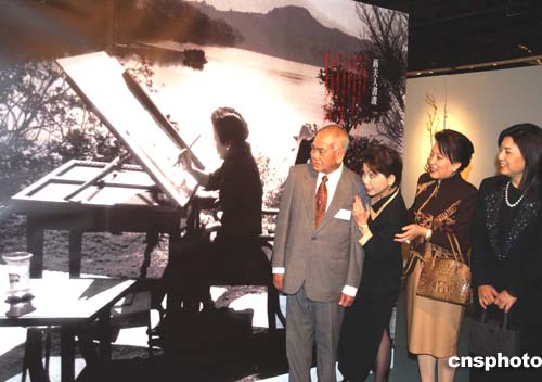 “世紀蔣宋美齡文物展”二月一日在美國洛杉磯開幕。宋美齡孫媳蔣方智怡(右一)、宋家代表宋曹琍璇(右二)與《世界日報》社長蘇民生夫婦一起,觀賞宋美齡創作國畫的巨幅照片。作者:賈國榮